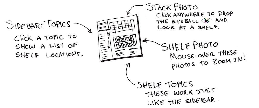 When you click open a Topic/Title, you'll get a list of other locations in the stacks where this Topic/Title appears. The Topics and Tags which appear below the shelf photos work the exact same way.